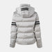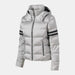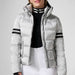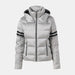 Kate puffer ski jacket: semi-tailored, above-hip length with high-loft vegan down-like insulation. 100% polyester stretch shell with 10K/10K waterproofing and DWR. Features powder skirt, adjustable hem, thumbhole cuffs, multiple pockets, YKK zippers, and detachable hood