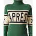 • Perfect Moment’s fitted Merino turtleneck features a bold “APRÈS” intarsia, ribbed trims, and hip-length silhouette—warm, stylish, and ideal for slopes or après-ski