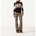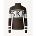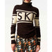 The Schild Sweater by Perfect Moment is a fitted Merino wool knit with a turtleneck and ribbed cuffs, featuring a bold "SKI" intarsia across the chest and star motifs on the sleeves. Designed to hit at the hip, it offers warmth and style for winter activities or casual wear