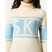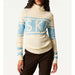 • The Schild Sweater by Perfect Moment is a fitted Merino wool knit with a turtleneck and ribbed cuffs, featuring a bold "SKI" intarsia across the chest and star motifs on the sleeves. Designed to hit at the hip, it offers warmth and style for winter activities or casual wear